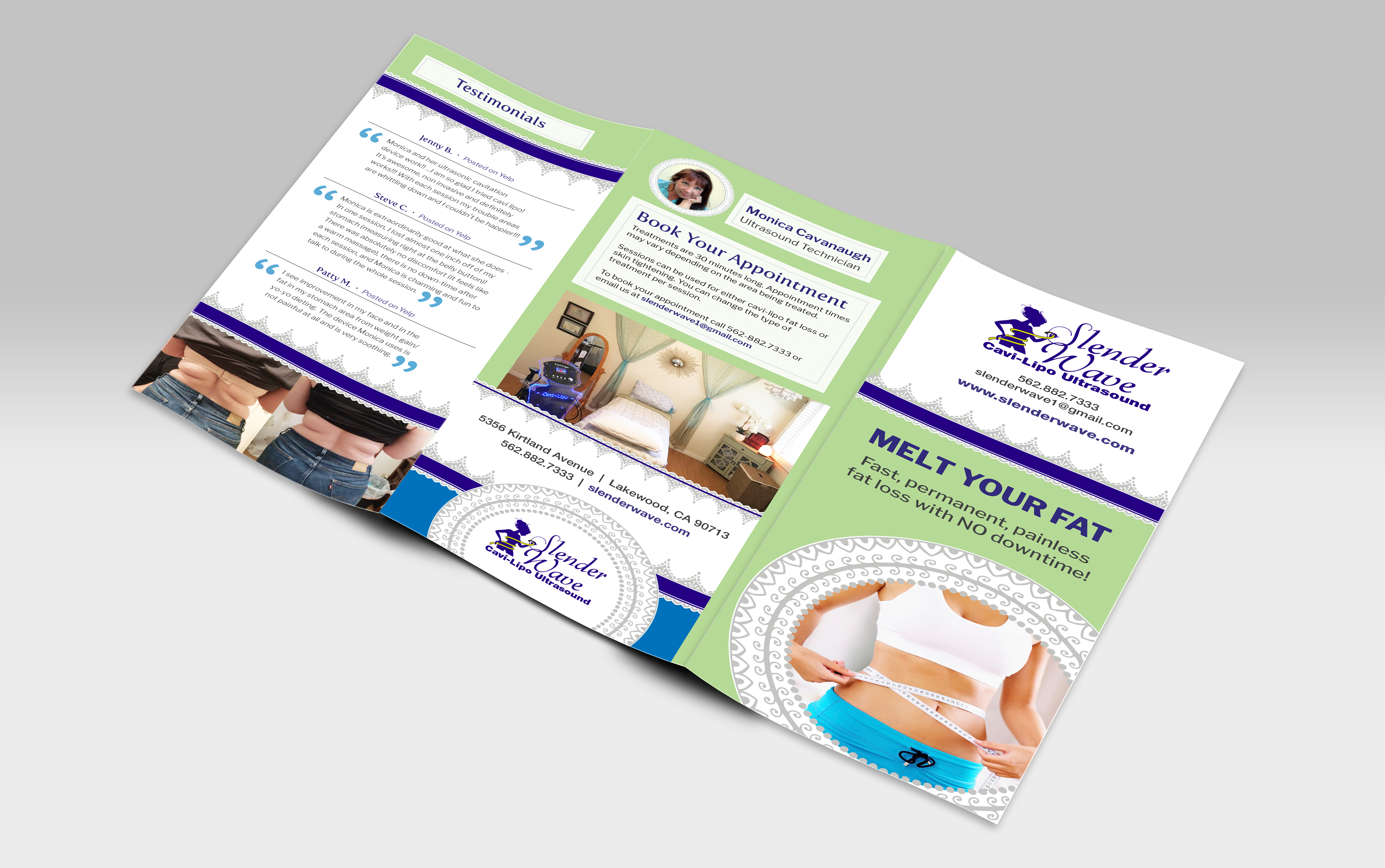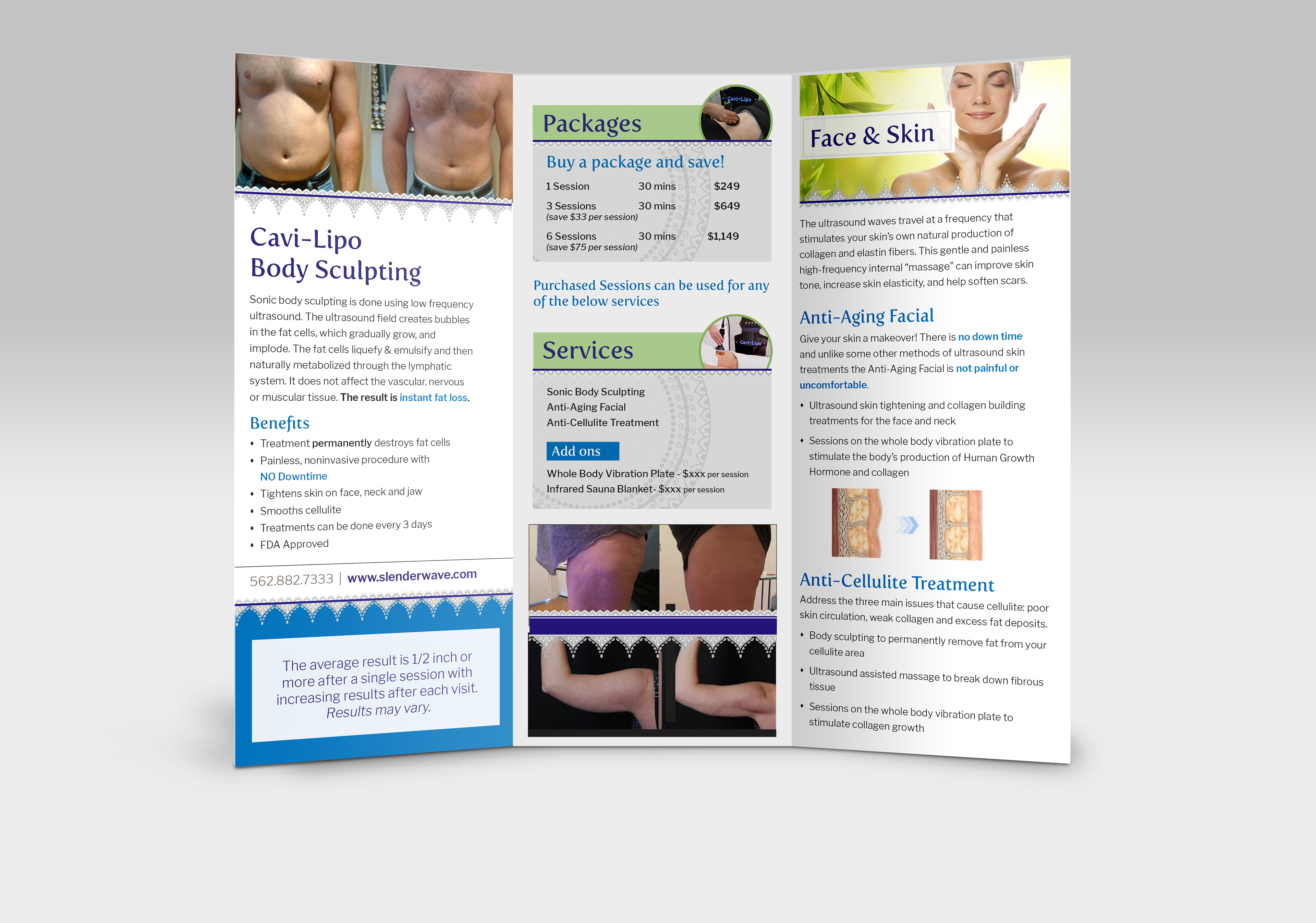 This is a tri-fold brochure for Slender Wave Cavi-Lipo Ultrasound